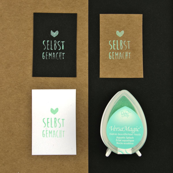 Stempelkissen mit kreideartiger, wasserbasierter Pigmenttine (chalk ink) in Tropfenform, hergestellt von der japanischen Marke Tsukineko. Die VersaMagic Stempelfarben haben nach dem Trocknen einen kreideartigen Look und eignen sich durch ihre hohe Deckkraft auch für dunkle Papiere und Untergründe.