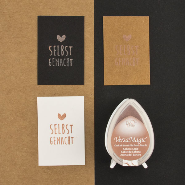 Stempelkissen mit kreideartiger, wasserbasierter Pigmenttine (chalk ink) in Tropfenform, hergestellt von der japanischen Marke Tsukineko. Die VersaMagic Stempelfarben haben nach dem Trocknen einen kreideartigen Look und eignen sich durch ihre hohe Deckkraft auch für dunkle Papiere und Untergründe.
