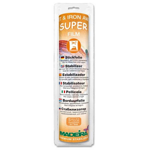 Perforiert und transparent, z.B. für wasserempfindliche Stoffe. Super Film von Madeira ist eine hitzeempfindliche Spezialfolie, die sich durch heißes Bügeln auflöst. Super Film ist perforiert und dadurch hervorragend geeignet für die Abzeichenstickerei, denn das Motiv lässt sich leicht und sauber ausreißen. Gegenüber wasserlöslichen Folien hat Madeira Super Film den Vorteil, dass auch wasserempfindliche Stoffe (z.B. Samt, Cord) verarbeitet werden können.