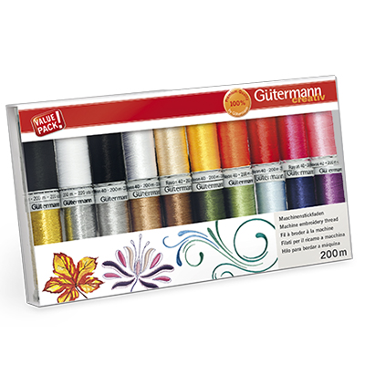Das große Set für kreative und präzise Maschinenstickarbeiten enthält neben 16 Spulen Rayon 40 200 m auch 2 Spulen Metallic 200 m: Silber und Gold. Außerdem dabei: 2 Spulen Bobbin.