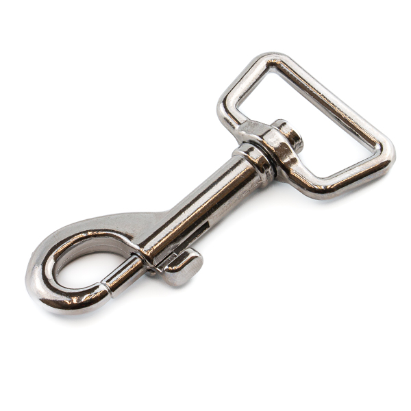 Verchromter Karabiner für bis zu 25 mm breite Bänder.
