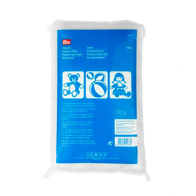 Die Füllwatte zum Füllen von Kissen, Decken, Puppen und vielem mehr, ist hygienisch, geruchsneutral, schwer entflammbar und formstabil. Mit ihr gefüllt, bleiben selbst Kuscheltiere in Form, die häufig gewaschen werden. Die Watte aus 100 % Polyester trocknet schnell und nimmt keine Gerüche der Umgebung an. Damit ist sie das perfekte Füllmaterial für Accessoires, die den Wohnraum verschönern. Prym bietet die Füllwatte in einem Beutel mit 250 g Inhalt an.