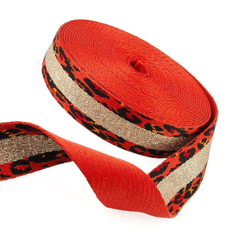 Gurtband aus 100% Polyester. Das Polyester-Gurtband mit Lurexfäden eignet sich als Tragegurt für Taschen und vieles mehr.