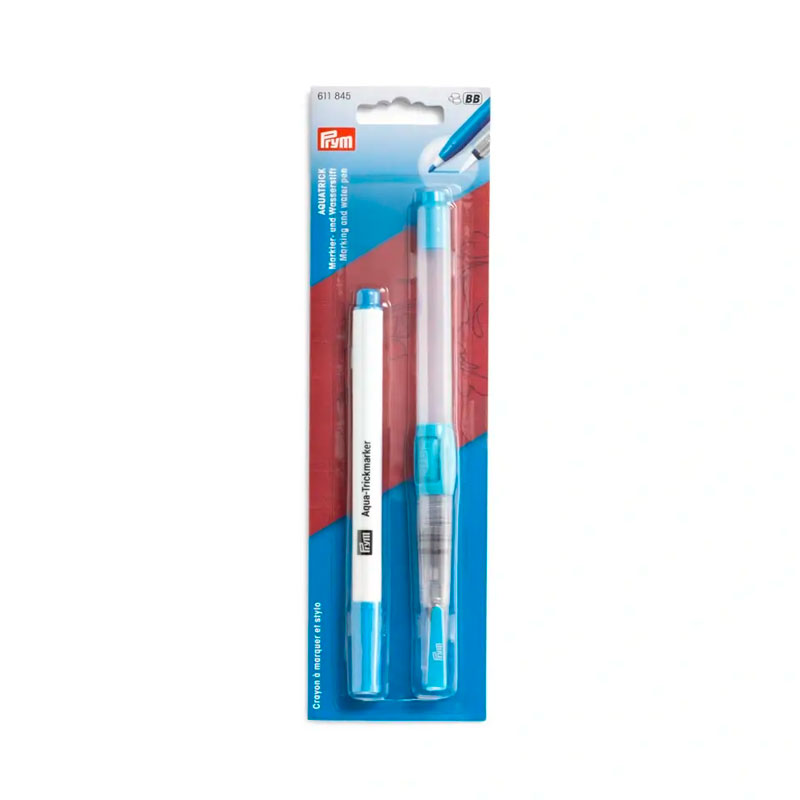 Eine Kombination, die es in sich hat: Mit dem wasserlöslichen Trick-Marker und dem Wasserstift geht das Anzeichnen und Entfernen von Linien beim Sticken, Nähen, Patchwork & Quilten etc. jetzt ganz leicht von der Hand. Der Trick-Marker ist besonders gut geeignet für das Anbringen von Markierungen auf Stoffen, wenn die aufgezeichneten Linien später nicht mehr sichtbar sein sollen. Er sollte senkrecht mit der Kappe nach unten gelagert werden, um ihn vor dem Austrocknen zu bewahren. Mit dem Wasserstift müssen die Markierungen punktgenau und spurlos vor dem Bügeln entfernt werden. Mit ihm lassen sich aber auch kurzfristige Markierungen übertragen: Der Stift wird mit Wasser aufgefüllt und erzeugt über seine feuchte Pinselspitze exakte Linien auf dem Stoff. Zusätzlich lassen sich mit einem Gemisch aus Wasser und Fleckenmittel mit dem Wasserstift mühelos auch Flecken entfernen. Wichtig: Die Markier- und Entfernungseigenschaften von Marker und Stift vorab an einem Musterstoff testen!