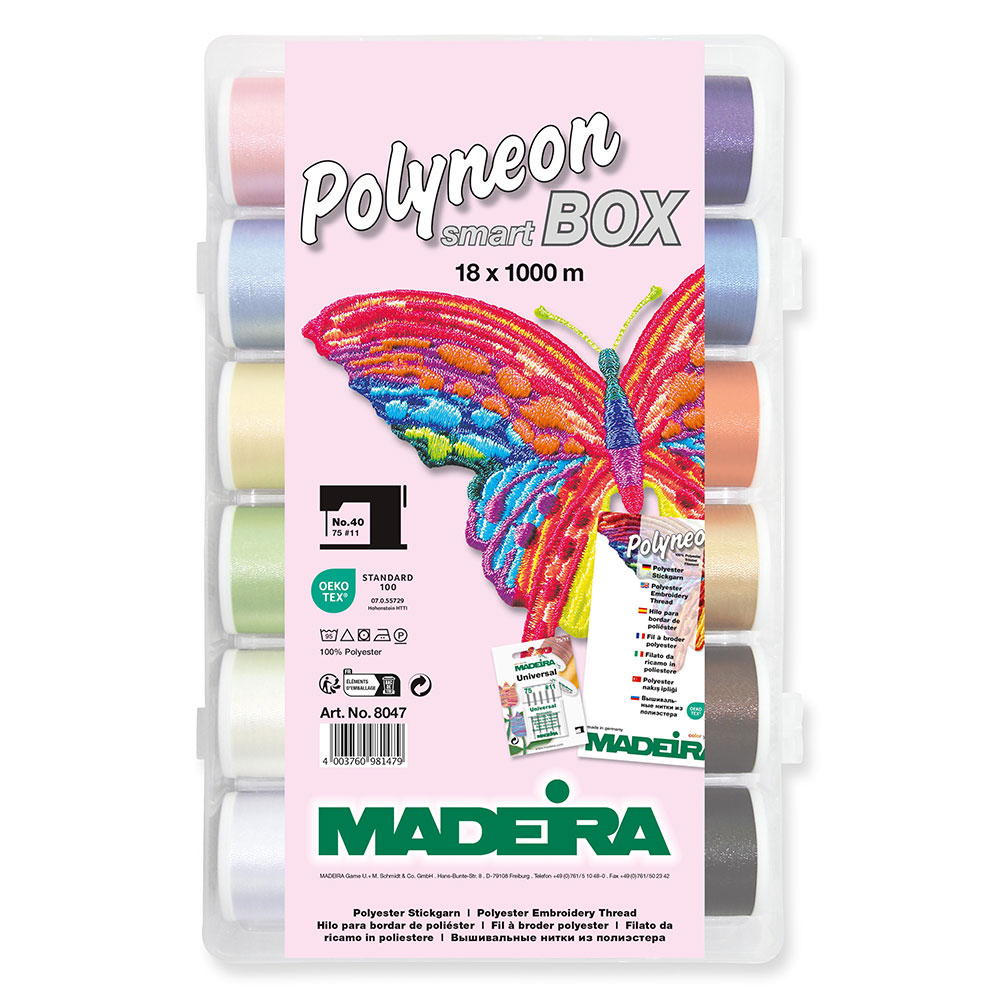 - Polyneon ist ein universelles Maschinenstickgarn aus reißfestem Polyesterfilament