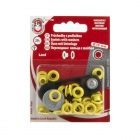 Metallösen mit 5,5mm Lochdurchmesser. Sie erhalten 20 Ösen und 20 passende Scheiben. Im Lieferumfang ist ein Einschlagwerkzeug enthalten, eine Anleitung befindet sich auf der Verpackungsrückseite.